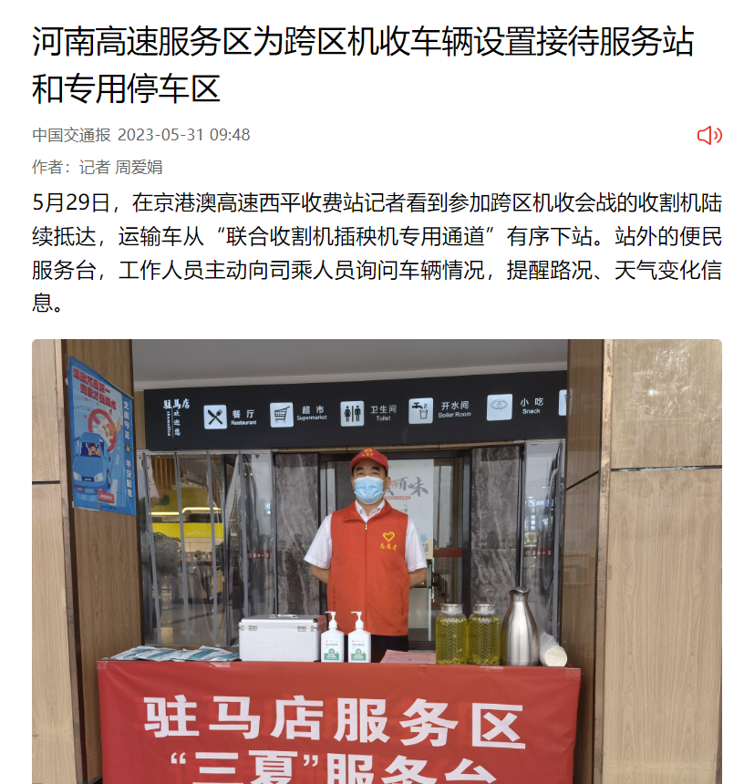 2023年5月31日,中國交通新聞網以題為《河南高速服務區(qū)為跨區(qū)機收車輛設置接待服務站和專用停車區(qū)》對服務區(qū)公司做好“三夏”生產服務保障工作進行了報道。網址:https://www.zgjtb.com/2023-05/31/content_358035.html截圖: